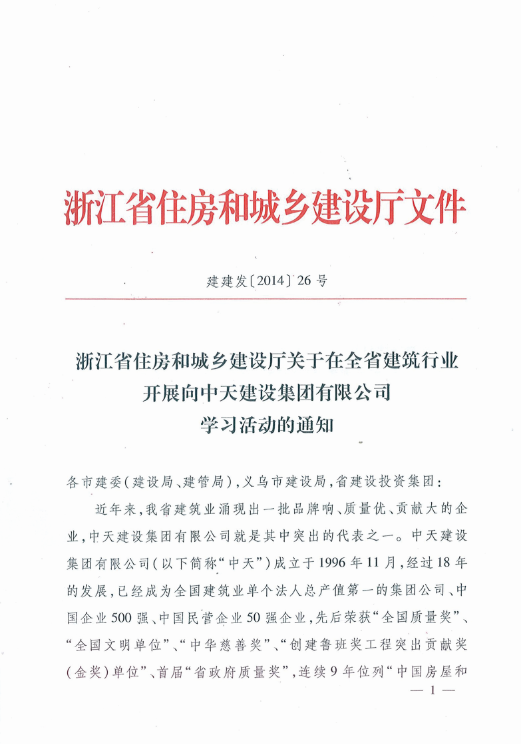 《浙江省住房和城乡建设厅关于在全省建筑行业开展向PG国际建设集团有限公司学习活动的通知》